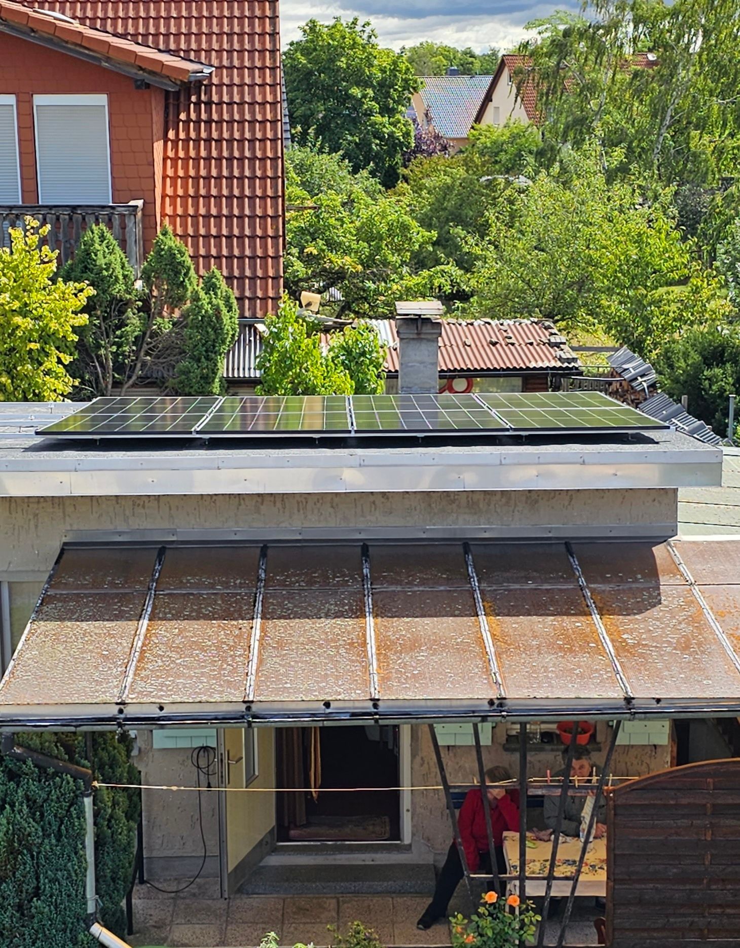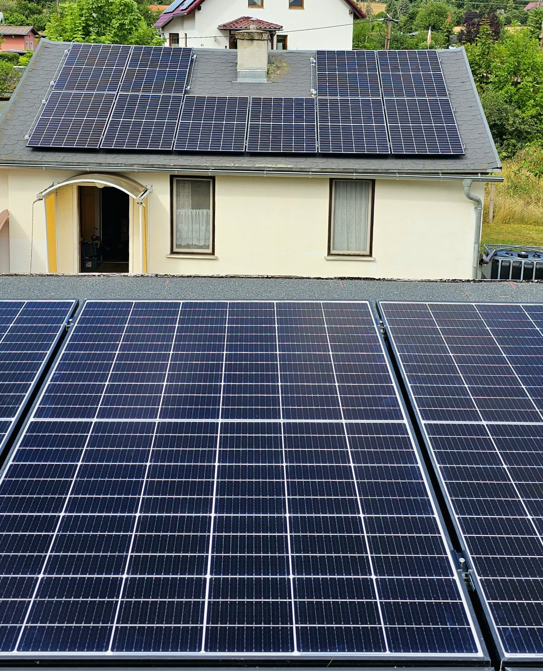 21 kWp Anlage in einem Garten mit Bitumendächern