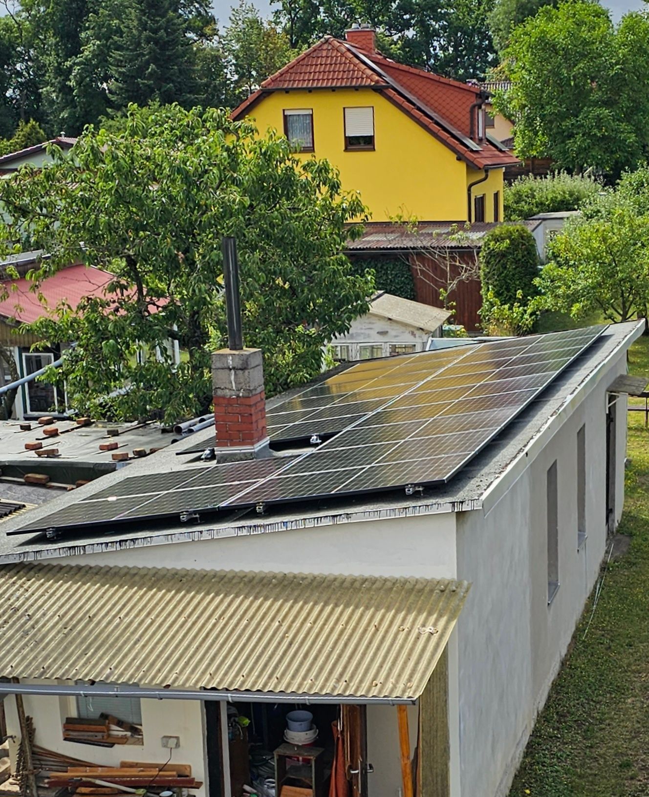 Hier haben wir eine21 kWp Anlage in einem Garten mit Bitumendächern montiert
